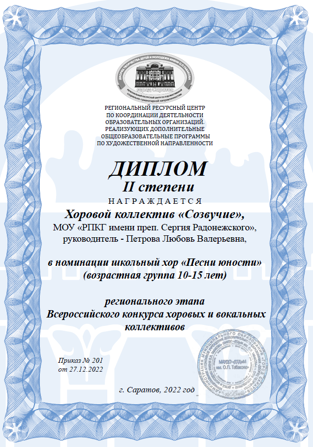 Диплом II степени Регионального этапа Всероссийского конкурса хоровых и вокальных коллективов