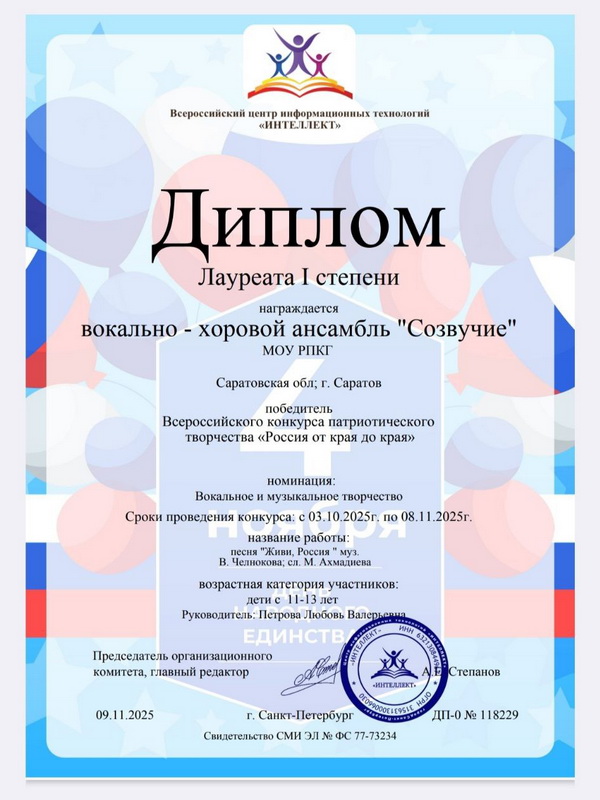 Диплом лауреата I степени Всероссийского конкуса патриотического творчества "Россия от края и до края"